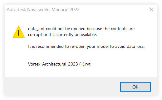 When opening a model using the Documents Plugin for Autodesk, users sometimes receive an error saying that a file cannot be opened because it's corrupt or unavailable.