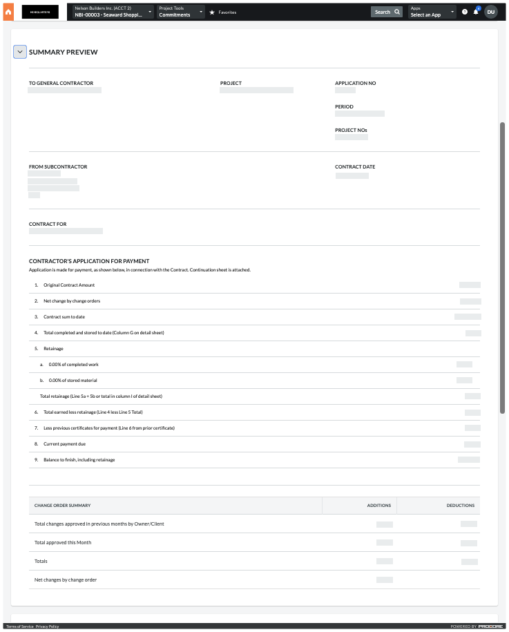 As you work on creating and editing your subcontractor payment application, you can expand the 'Summary Preview' card on your payment application to see what your final payment application is going to look like.